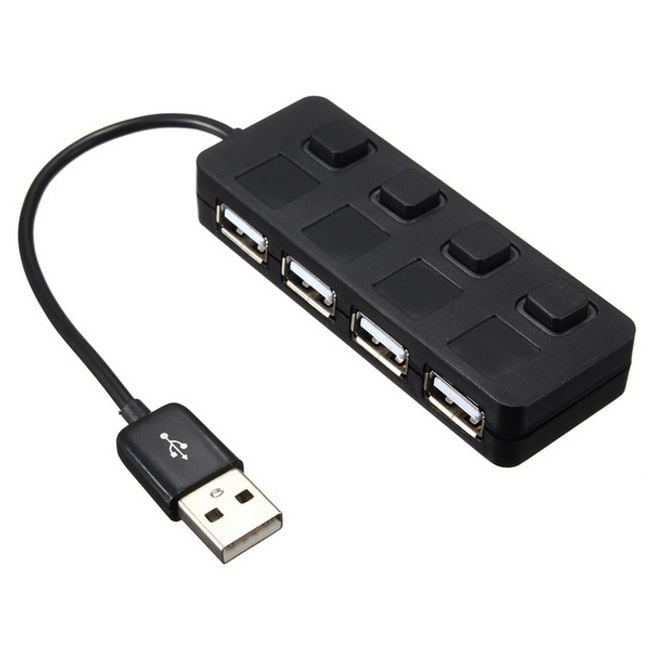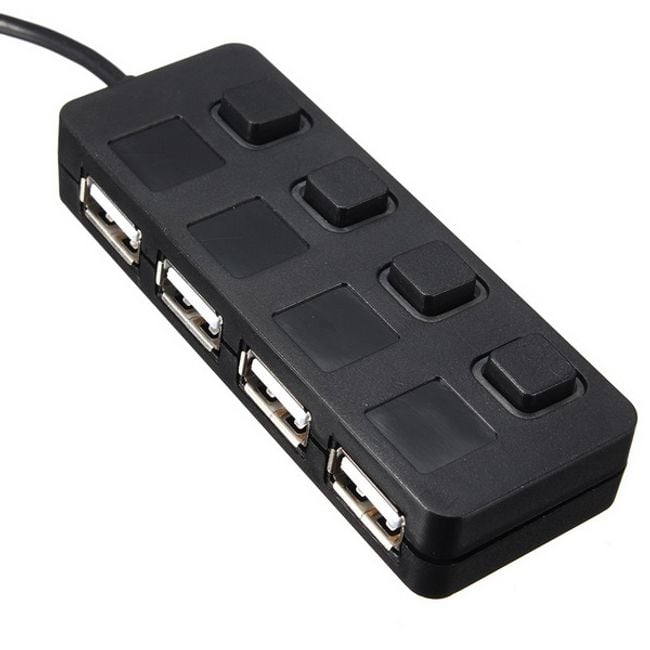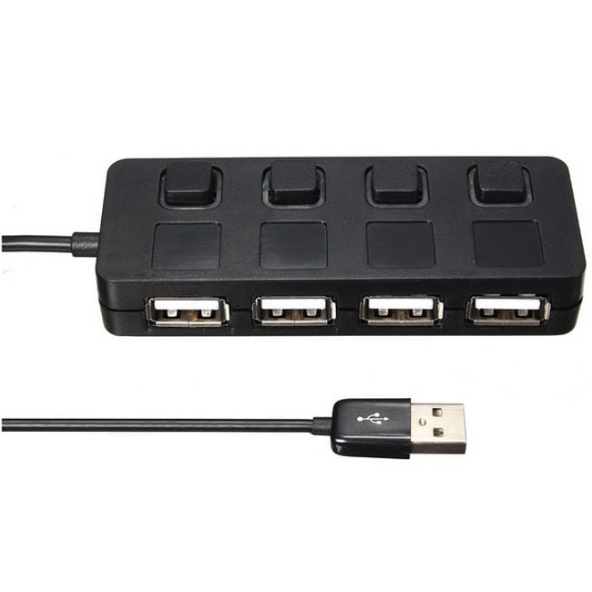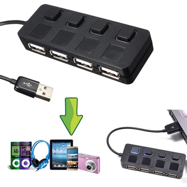 4-Port USB 2.0 HUB mit Taster eignet sich für alle Computer und Laptops. Der HUB bietet vier Anschlüsse, an die Sie verschiedene Geräte anschließen können. Aktive (eingeschaltete) Anschlüsse sind mit blauem LED-Licht beleuchtet. Die schwarze Farbe passt zu den meisten Geräten.
