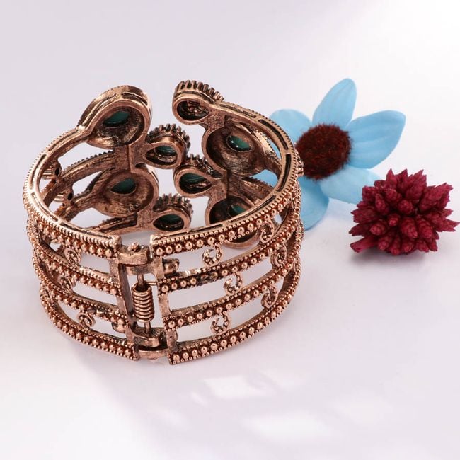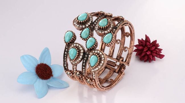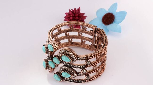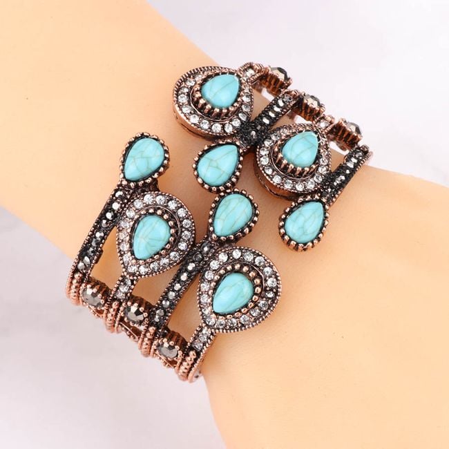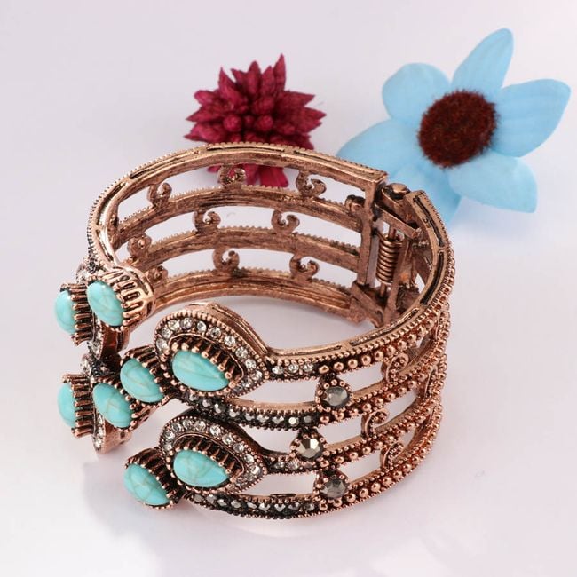 Das aufklappbare Armband ist mit einer Vielzahl von blauen Tropfen verziert.