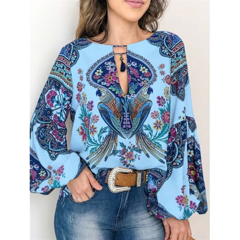 Damenbluse mit langen, ausgestellten Ärmeln und Schnürung am Ausschnitt. Lockere Passform mit buntem Muster. Mehrere Varianten.
