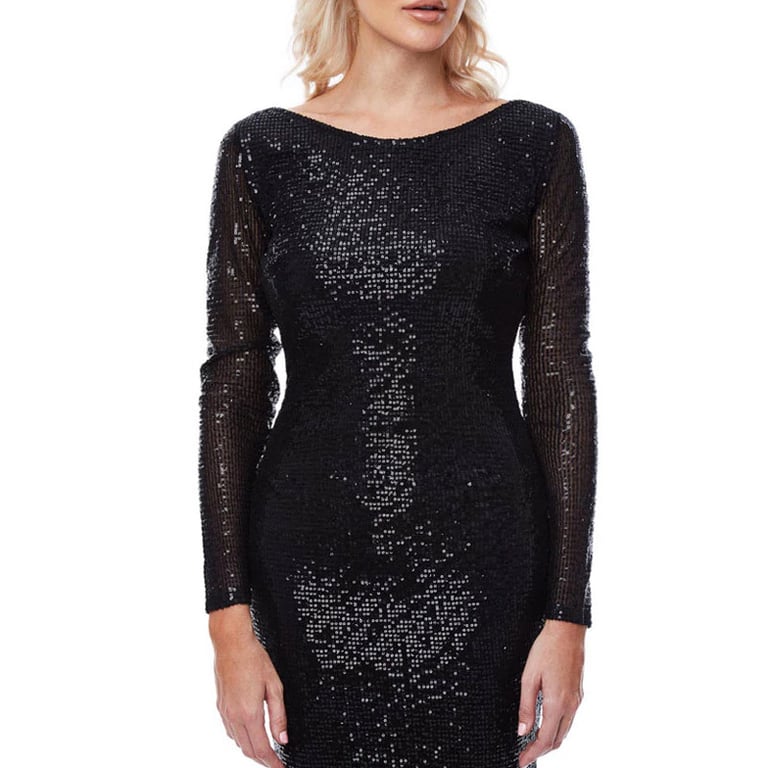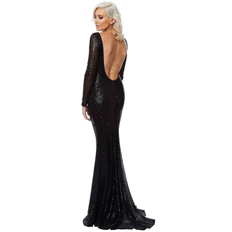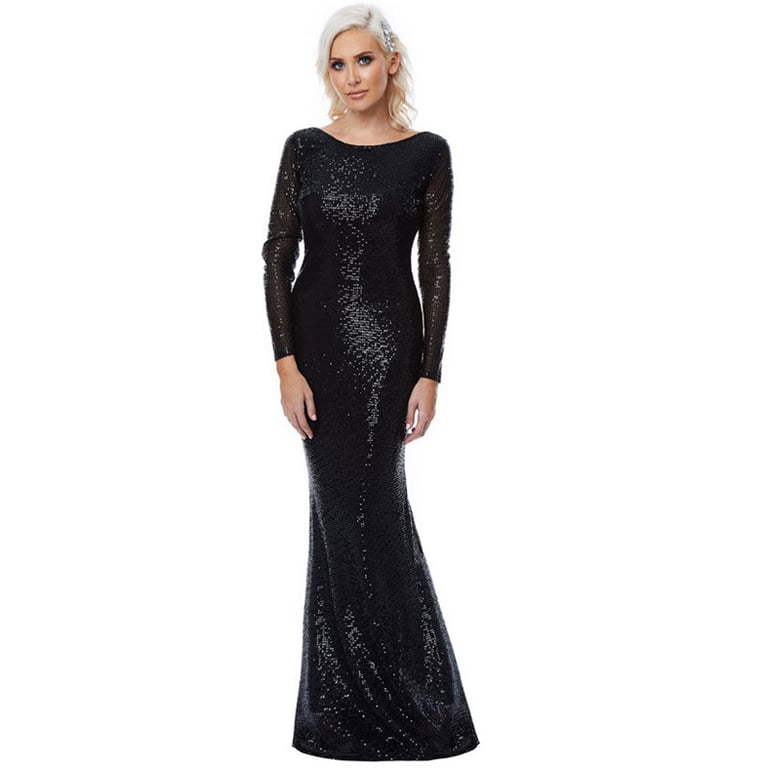 Damen lange Abend- oder Ballkleider. Das Kleid hat lange Ärmel und einen tiefen Ausschnitt auf der Rückseite. Das gesamte Kleid ist mit Pailletten verziert, die ihm einen großen Glanz verleihen. Erhältlich in zwei Farben – Schwarz und Silber.