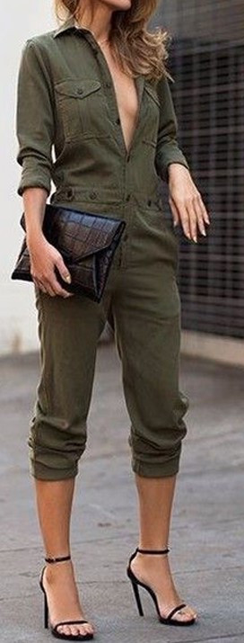 Trendige Overalls mit langen Ärmeln im Army-Stil. Grüne Farbe, Knopfverschluss.