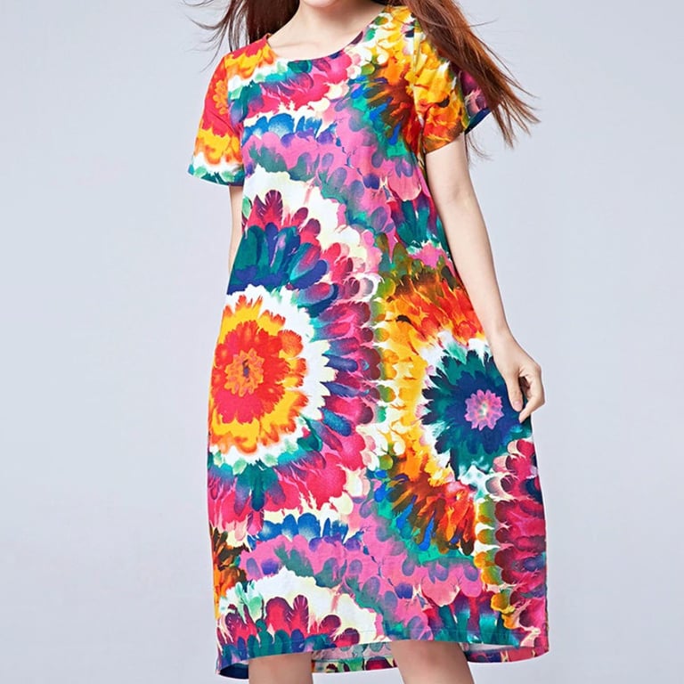 Lassen Sie sich von einer Imitation des Batikmusters mit frischen Blumenmotiven mitreißen. Die Sackkleider sind sehr bequem, luftig und verfügen über praktische Taschen.