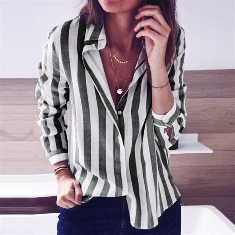 Damenbluse mit gestreiftem Muster und langen Ärmeln. Die Bluse hat einen lockeren Schnitt, einen V-Ausschnitt mit Kragen und eine Knopfleiste. Erhältlich in mehreren Farbvarianten.
