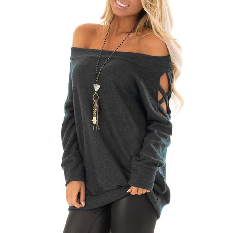 Damen Hoodie-Top mit Ausschnitt und freiliegenden Schultern. Lockere Passform. Lange Ärmel mit dekorativer Lochung. In mehreren Farbvarianten erhältlich.