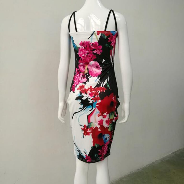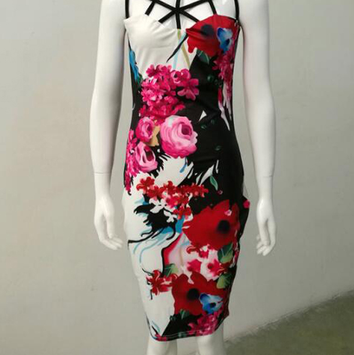 Damen lange Etuikleider mit Blumen. Der Blumenprint wirkt dreidimensional. Sie betonen schön die weiblichen Kurven. Sie haben schmale Träger und der Ausschnitt ist mit feinen schwarzen Schnüren durchzogen.