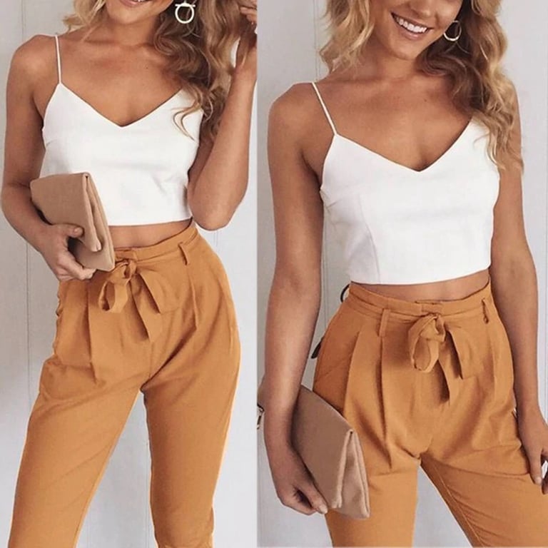 Elegantes Damen-Set. Weißes Crop-Top mit Spaghettiträgern und V-Ausschnitt. Bunte Hose mit hohem Bund und Schleifenbindung.