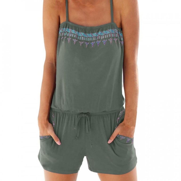 Damen Sommeroverall mit Trägern. Lockere Passform mit kurzen Beinen und elastischem Gummibund. Zwei seitliche Taschen. Mehrere Farbvarianten verfügbar.