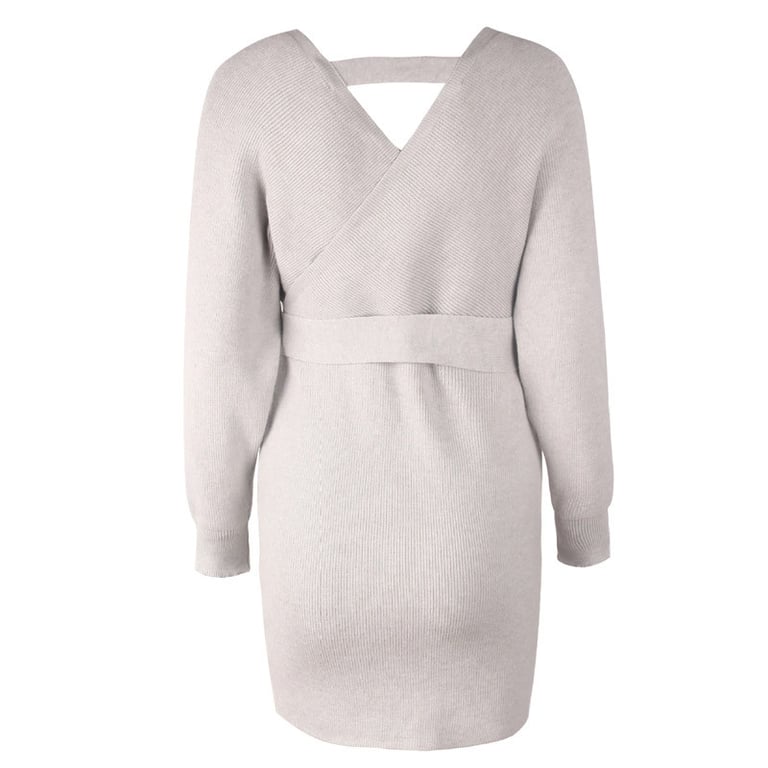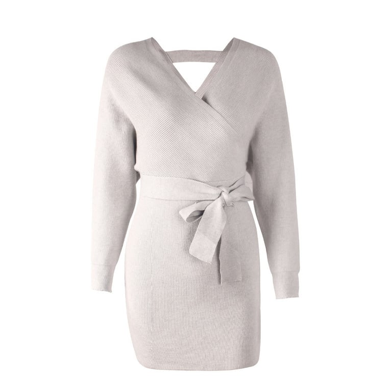 Damen Strick-Mini-Kleid mit einer Länge unter dem Po, langen Ärmeln und einer Taillenschnürung. Das Kleid hat einen überlappenden V-Ausschnitt. Erhältlich in mehreren Farbvarianten.