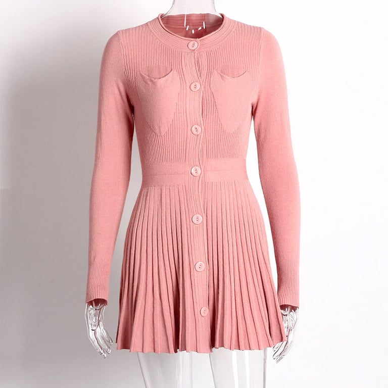 Damen Strickkleid mit langen Ärmeln und kurzer, gefalteter Rock. Das Kleid hat einen runden Ausschnitt und eine Knopfleiste auf der Vorderseite.