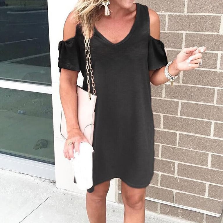 Damen T-Shirt Kleid mit kurzen Ärmeln und freiliegenden Schultern. Lockere, bequeme Passform. Einfarbig. In mehreren Varianten erhältlich.