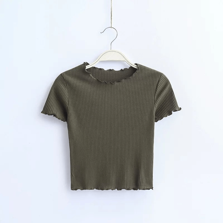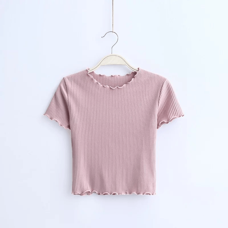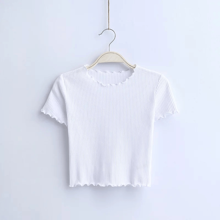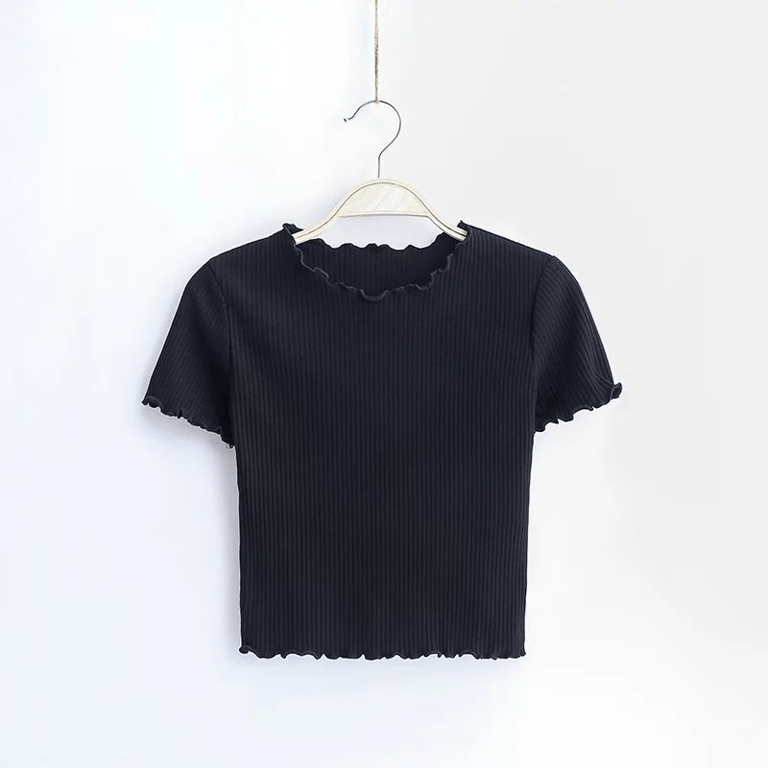 Kurzärmeliges Damen T-Shirt, ideal für die Sommerzeit. Der Saum ist aus feinen Wellen, die ihm einen romantischen Look verleihen.