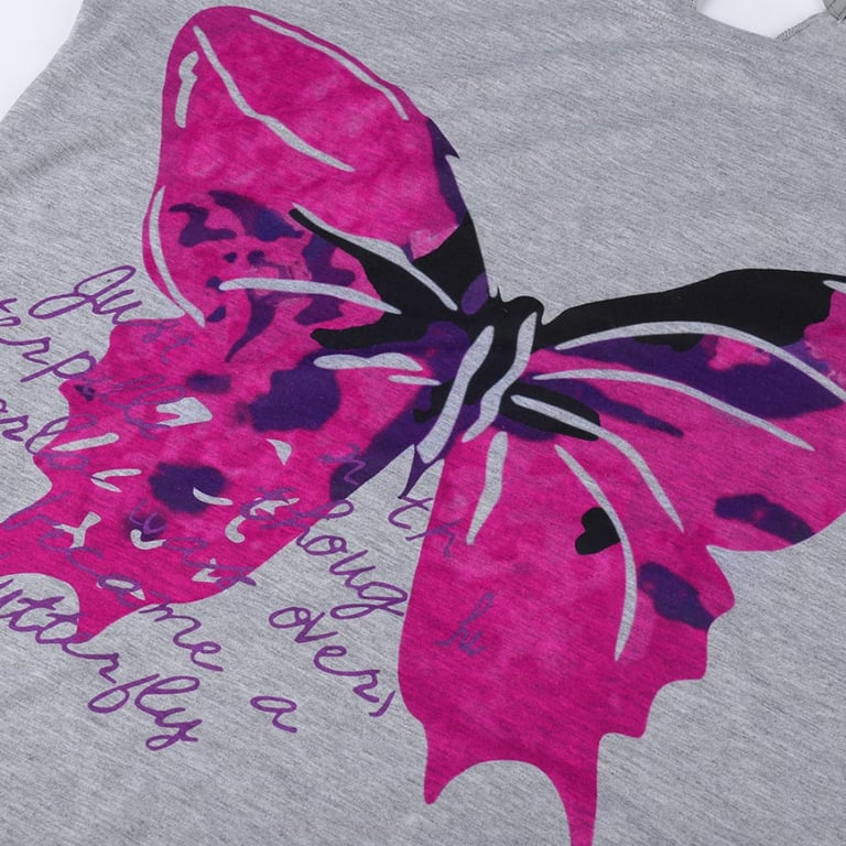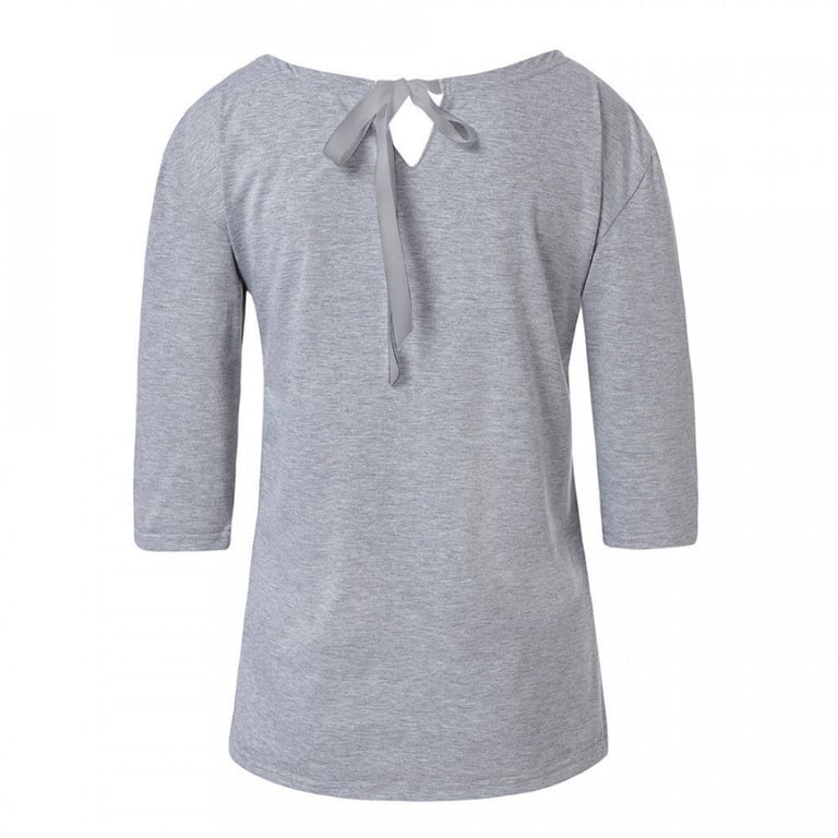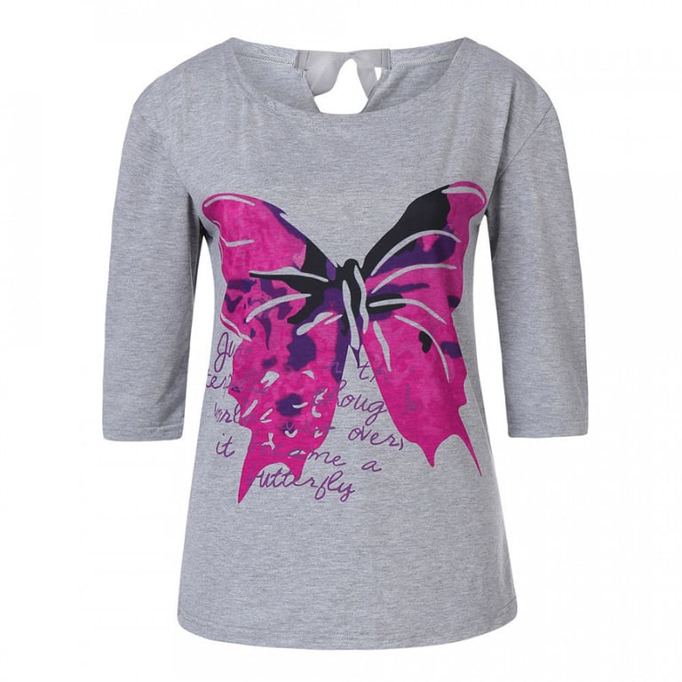 Damen T-Shirt mit Dreiviertelärmeln. Das Shirt hat einen runden Ausschnitt und überschnittene Schultern. Auf der Rückseite mit einer Schleife zum Binden am Hals und auf der Vorderseite mit einem bunten Schmetterlingsdruck.