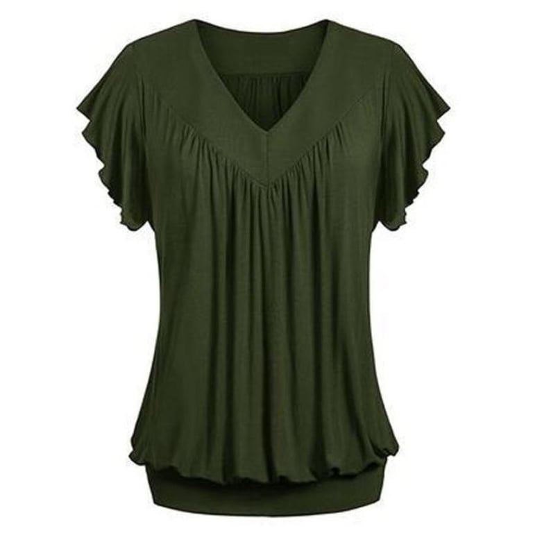 Damen T-Shirt mit kurzen Ärmeln und V-Ausschnitt mit Raffung. Das Shirt hat einen lockeren Schnitt mit elastischem Bund. Erhältlich in mehreren Varianten.