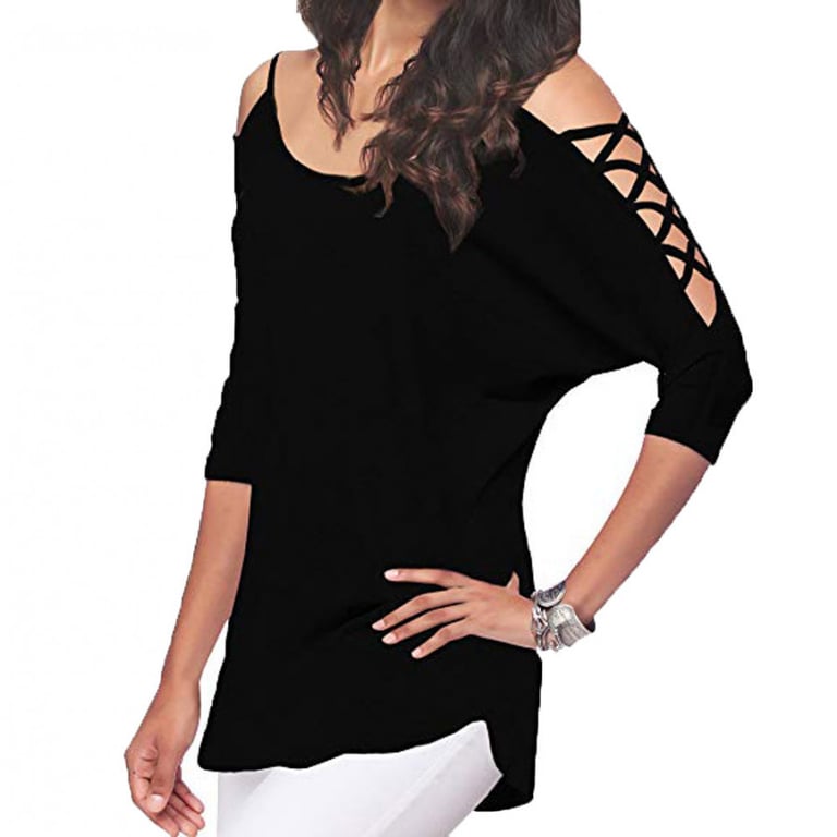 Damenoberteil mit 3/4-Ärmeln, dekorativen Durchbrüchen und freiliegenden Schultern. Lockere, bequeme Passform. In mehreren Farbvarianten erhältlich.