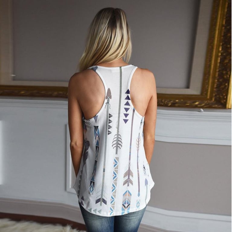 Damen Tanktop mit gekreuzten Trägern auf dem Rücken und rundem Ausschnitt. Lockere gerade Passform. Origineller Druck auf beiden Seiten.