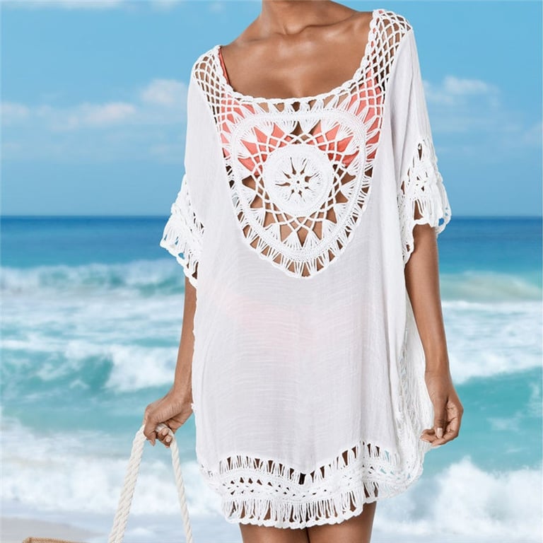 Damen Tunika Bluse mit 3/4-Ärmeln. Lockere, bequeme Passform mit dekorativem Lochmuster. Ideal als Überwurf über Badebekleidung. Universelle Größe.