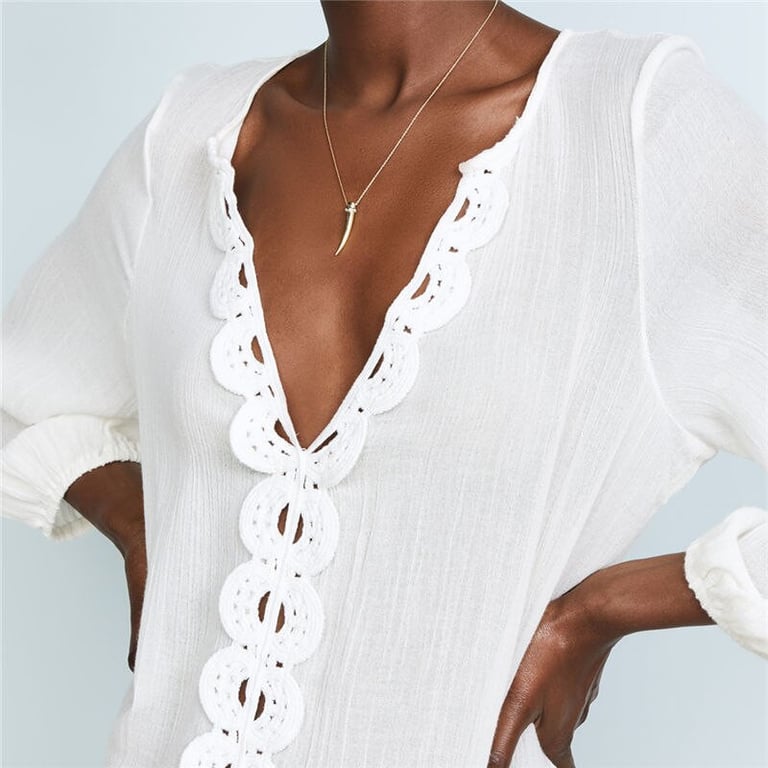 Damen Tunika Bluse mit 3/4-Ärmeln. Lockere, bequeme Passform mit dekorativem Lochmuster. Ideal als Überwurf über Badeanzüge. Universelle Größe.