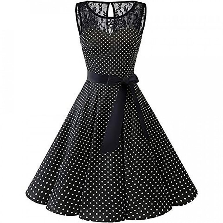 Damenkleid im Vintage-Stil. Das Kleid ist ärmellos mit einem mit Spitze verzierten Ausschnitt. Weit ausgestellter Rock mit einem Band in der Taille. Gepunktetes Muster. Erhältlich in mehreren Farben.