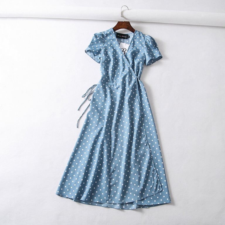 Damen leichte Wickelkleider. Langer Schnitt mit Bindeband in der Taille. Das Kleid hat kurze Ärmel und einen V-Ausschnitt. Erhältlich in mehreren Varianten.