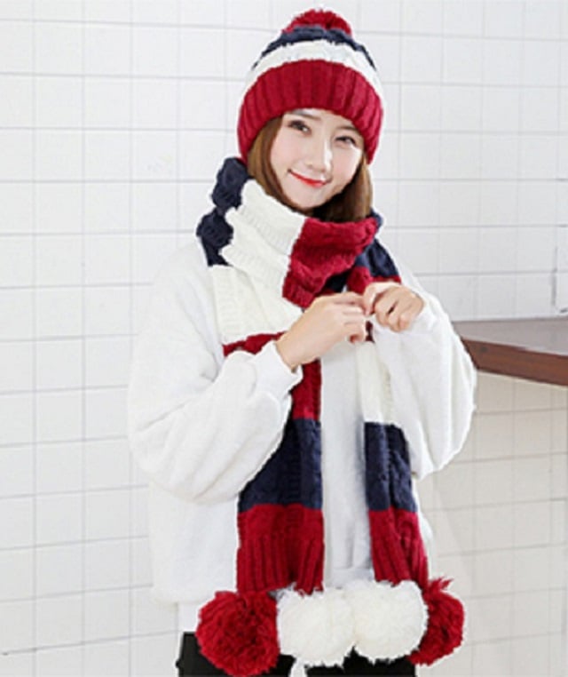 Schönes gestricktes Winterset mit einer Mütze mit Bommel und einem gleichfarbigen Schal.