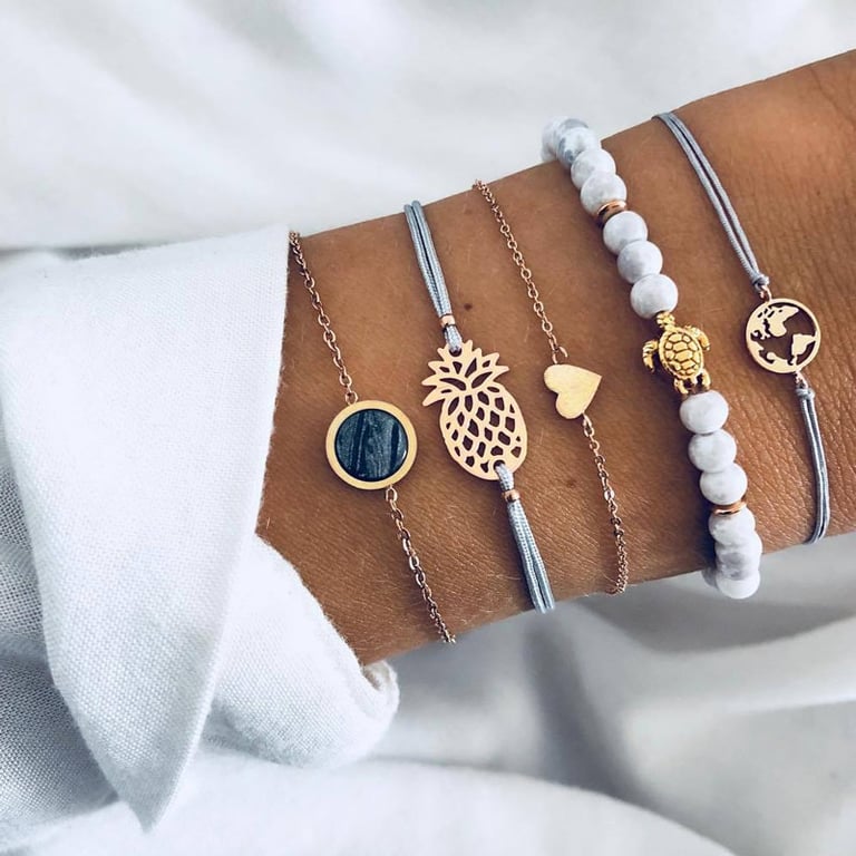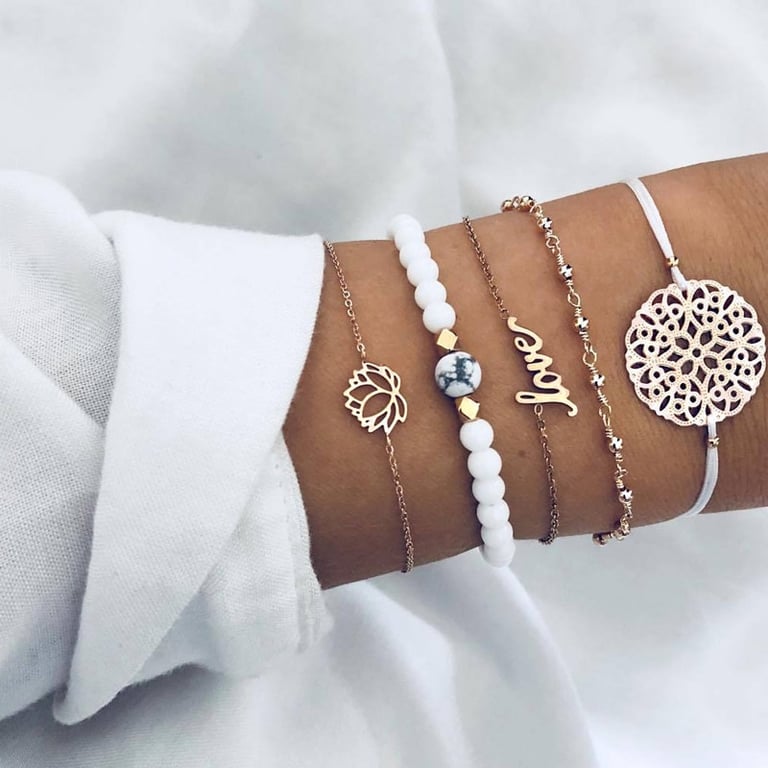 Ein Set schöner Damenarmbänder mit verschiedenen Mustern, wie Herzen und anderen. Das Armband ist sehr dezent und passt zu allem.