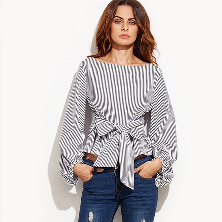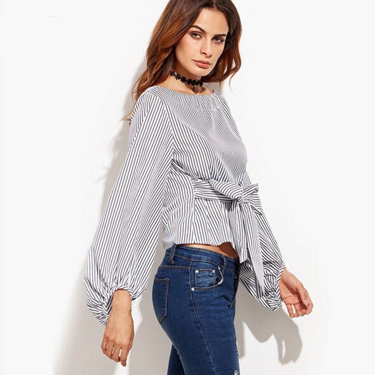 Damenbluse mit weiten Ballonärmeln und einem Bootsausschnitt. Die Bluse hat ein gestreiftes Muster und kann in der Taille mit einer Schleife gerafft werden.