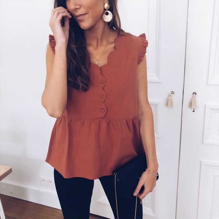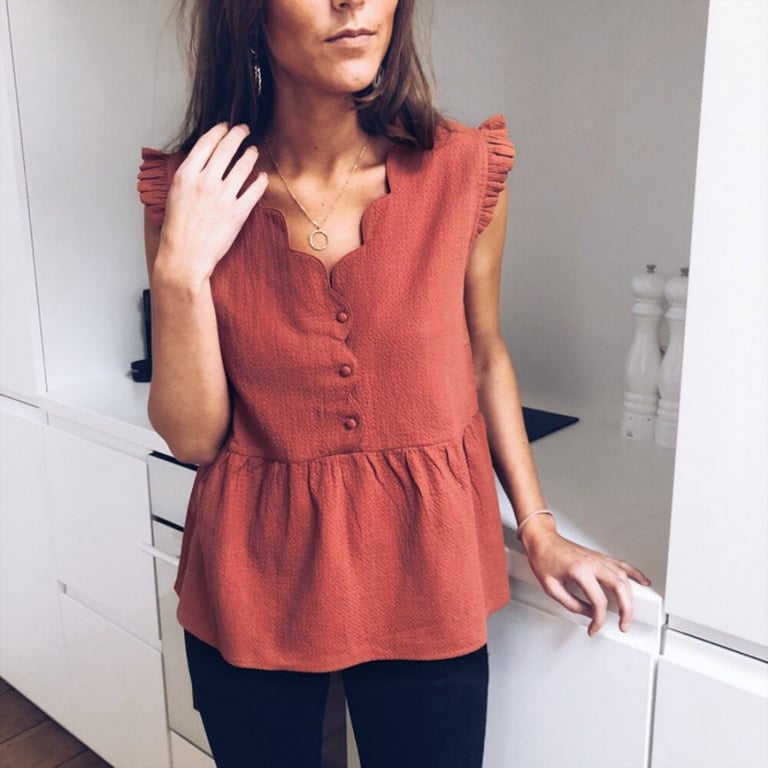 Damenbluse mit kurzen Ärmeln und Rüsche. Ausschnitt mit Knopfverschluss. Lockerer, weiter Schnitt.