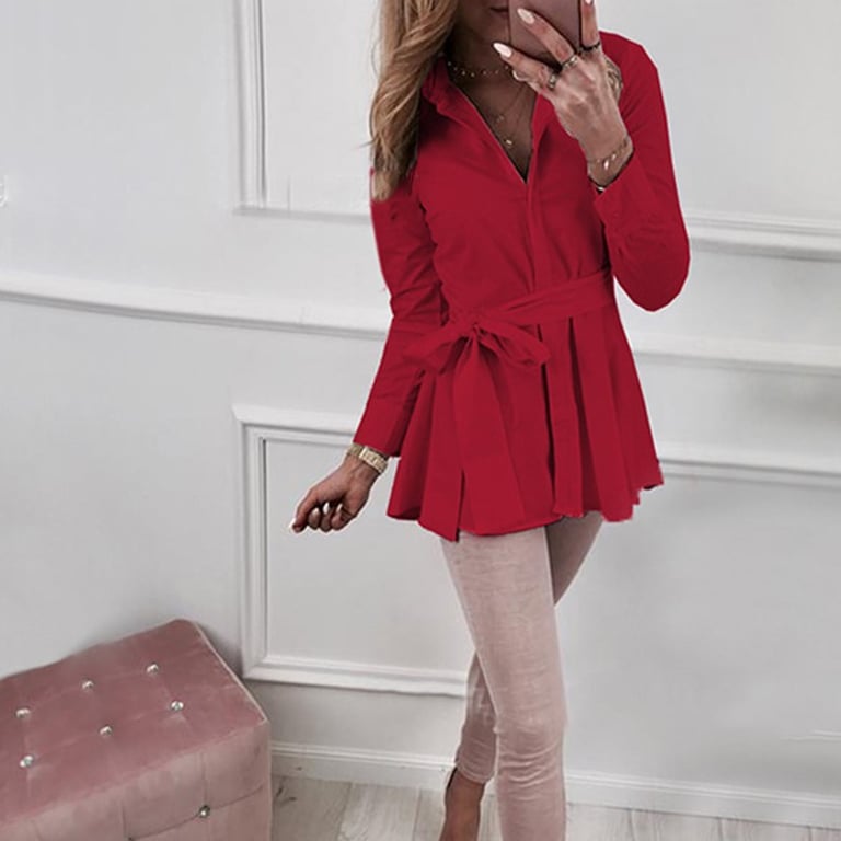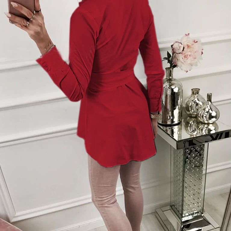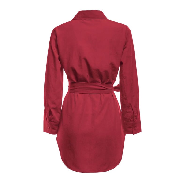 Damenbluse mit langen Ärmeln und V-Ausschnitt mit Kragen. Die Bluse hat eine Knopfleiste und einen Bindegürtel in der Taille. Erhältlich in mehreren Farben.