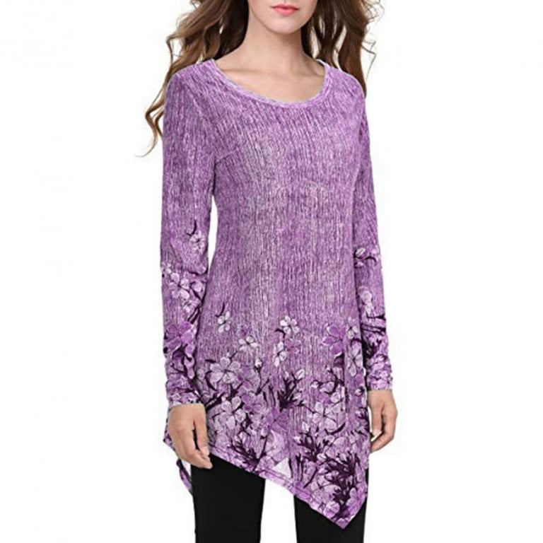 Damenbluse mit langen Ärmeln und rundem Ausschnitt. Lockere asymmetrische Passform. Plus-Size-Größen. Erhältlich in mehreren Farbvarianten.