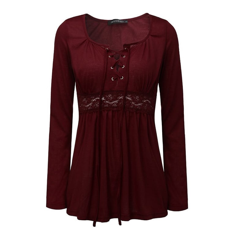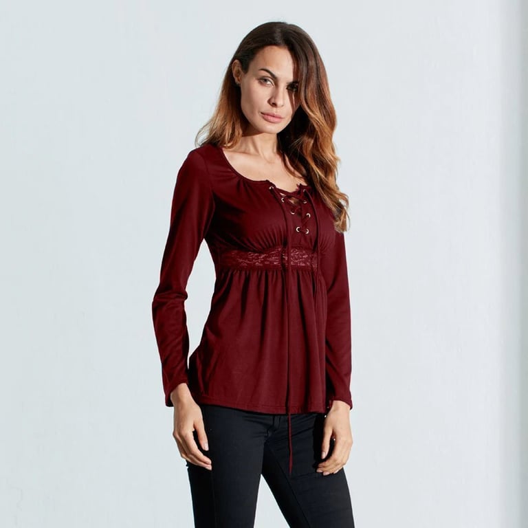 Damenoberteil mit langen Ärmeln. Die Bluse hat einen Spitzenrand unter der Brust und einen runden Ausschnitt, der mit Schnürungen verziert ist. Erhältlich in mehreren Farben und Plus-Size-Größen.