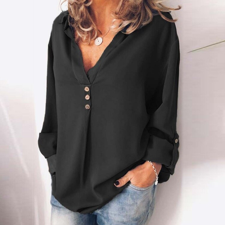 Damenbluse mit langen Ärmeln. Die Bluse hat einen lockeren, bequemen Schnitt mit V-Ausschnitt und Knöpfen. Erhältlich in mehreren Farbvarianten.