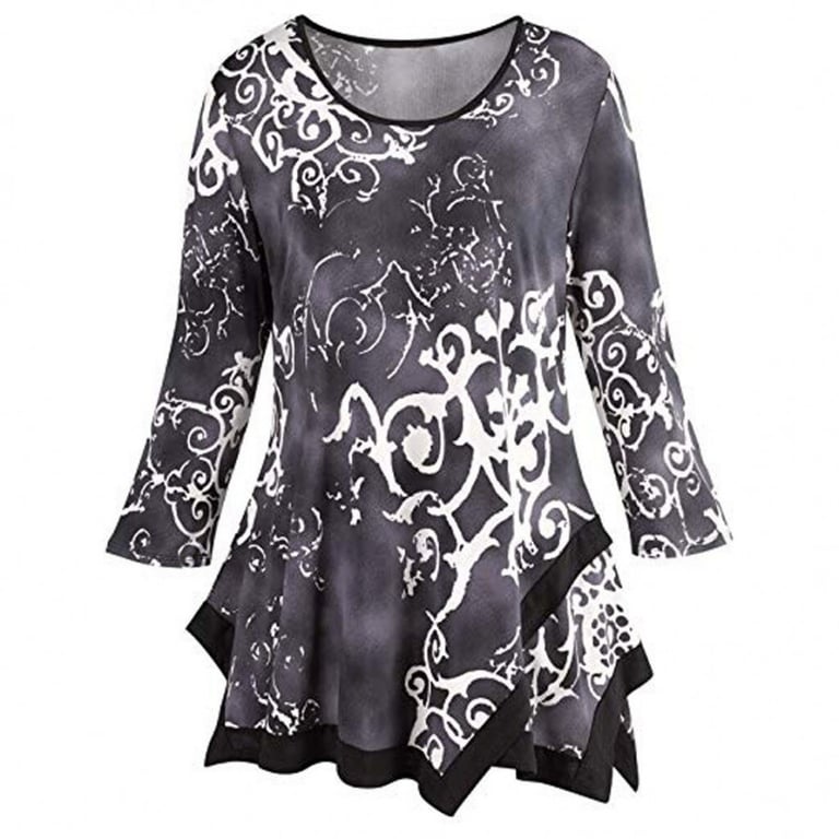 Damenbluse mit 3/4-Ärmeln und rundem Ausschnitt. Längerer Schnitt mit Volants. Bedruckt mit buntem Muster. In mehreren Varianten erhältlich.