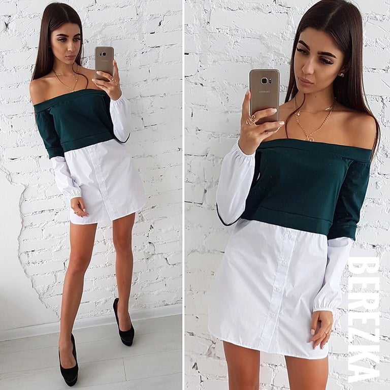 Damen Mini-Kleid mit langen Ärmeln. Das Kleid ist im Hemdenstil mit freiliegenden Schultern und langen Ärmeln gestaltet. Erhältlich in mehreren Farben.