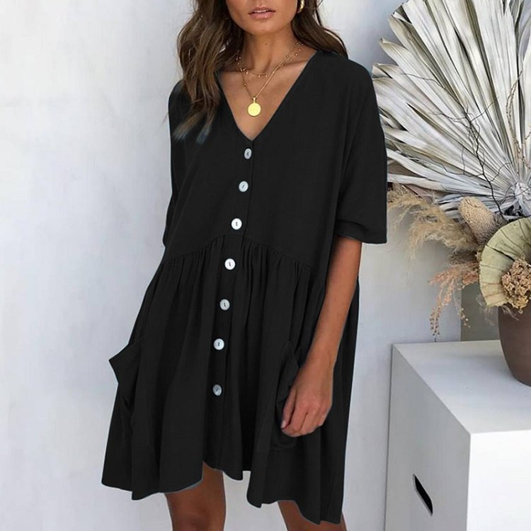 Damenkleid mit Knopfverschluss. Das Kleid hat kurze Ärmel und einen V-Ausschnitt. Lockere Passform mit Raffung und zwei seitlichen Taschen. In mehreren Farbvarianten erhältlich.