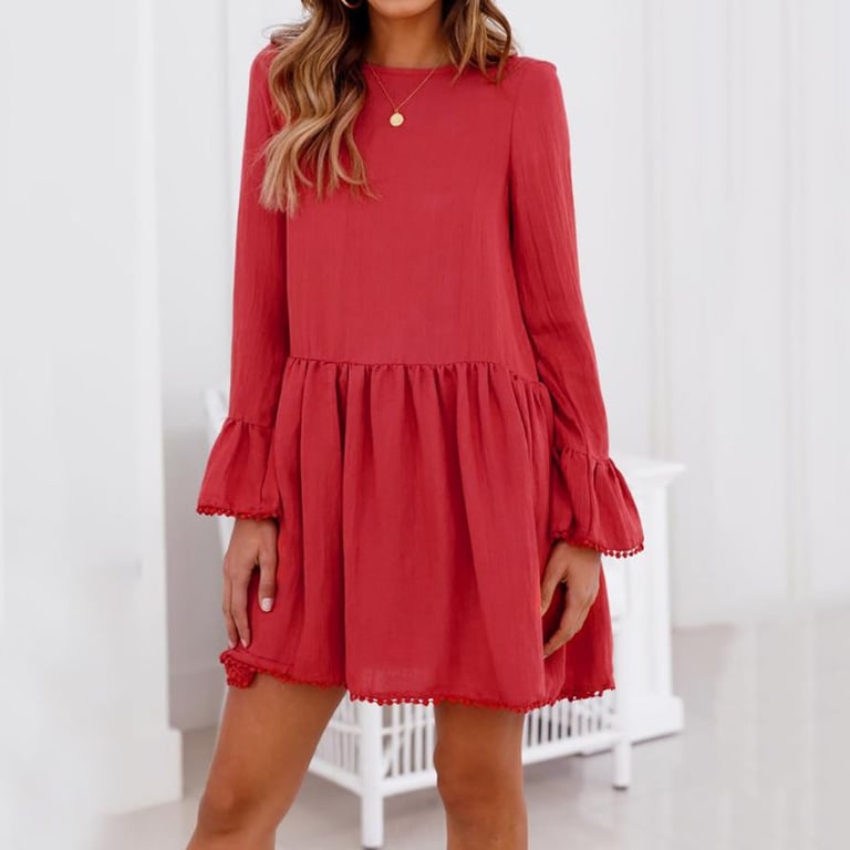 Damenkleid im lockeren Schnitt mit langen Ärmeln und Rüschendetails. Das Kleid hat auf der Rückseite einen Ausschnitt mit einer dekorativen Schnürung.