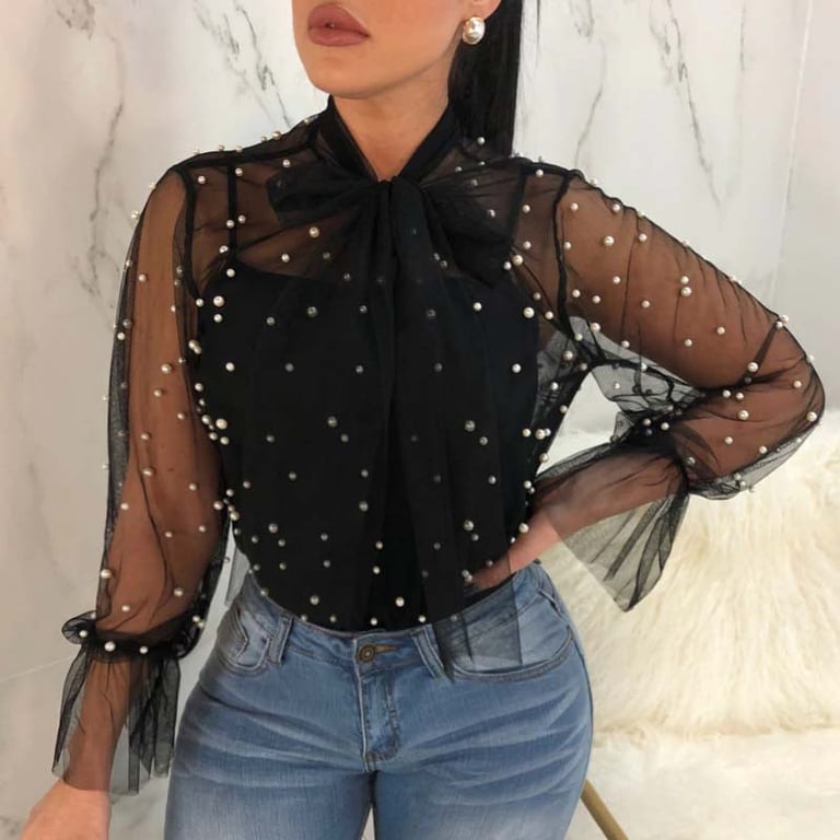 Stylische Bluse mit Perlen, in der Sie absolut großartig aussehen werden! Perlen sind jede Saison modisch, unabhängig von der Jahreszeit. Probieren Sie die Neuheit aus unserem Sortiment für die Saison 2025 und beleben Sie Ihre Garderobe.