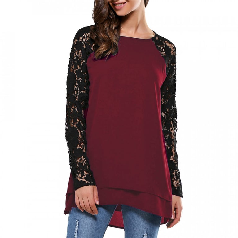 Damenoberteil mit langen Ärmeln, verziert mit Spitze und rundem Ausschnitt. Das Oberteil hat einen lockeren, asymmetrischen Schnitt. Erhältlich in mehreren Farbvarianten.