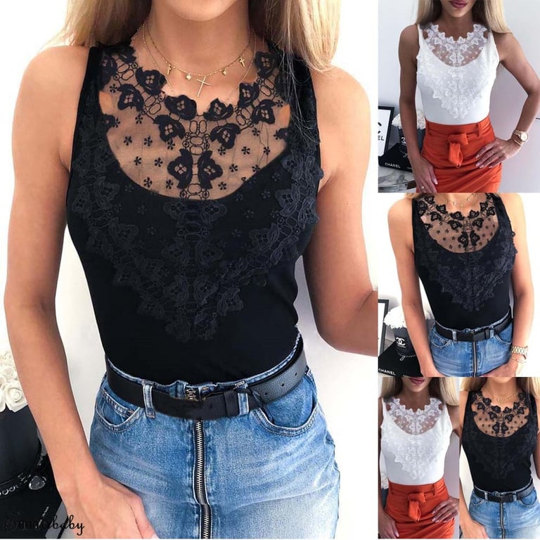 Damen elegantes Top mit Spitzenverzierung. Es ist ärmellos und in Schwarz und Weiß erhältlich.