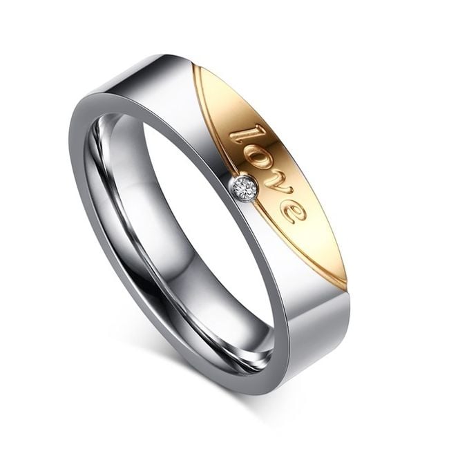 Der Trauring ist zweifarbig (goldene Farbe, silberne Farbe). Der Damenring ist mit der Aufschrift "love" und einem kleinen klaren Stein verziert, und der Herrenring ist mit der Aufschrift "forever" verziert. Sie haben die Wahl zwischen mehreren Größen.