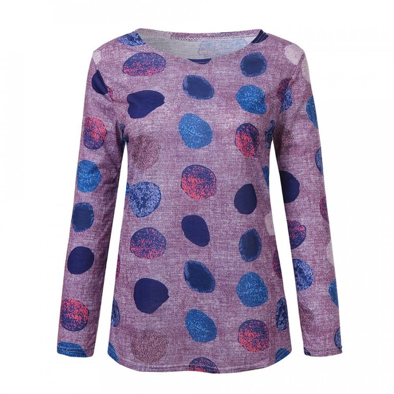 Damen T-Shirt mit langen Ärmeln und rundem Ausschnitt. Bequemes, angenehmes Material. Gerade Schnittform. Das T-Shirt hat einen Druck mit Punktmuster. Plus-Size-Größen. Erhältlich in mehreren Varianten.