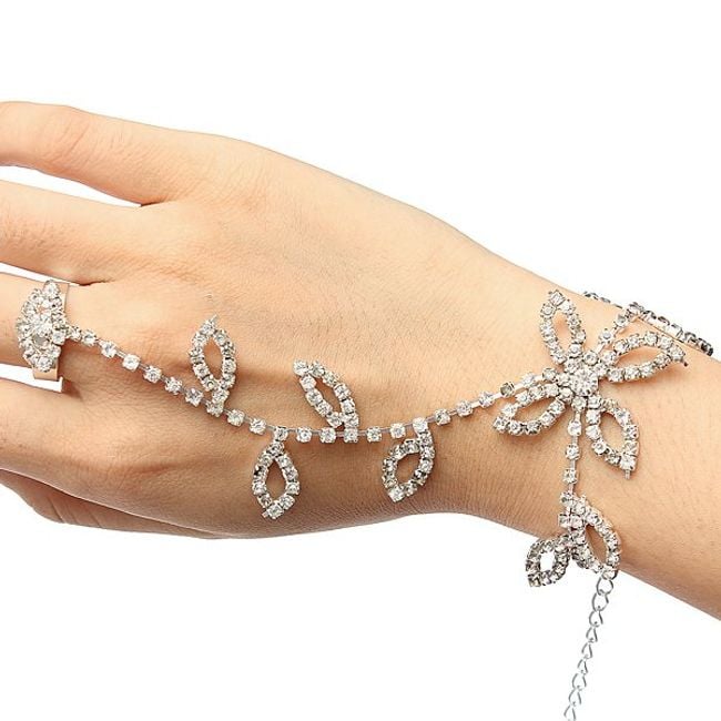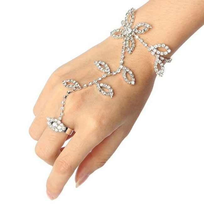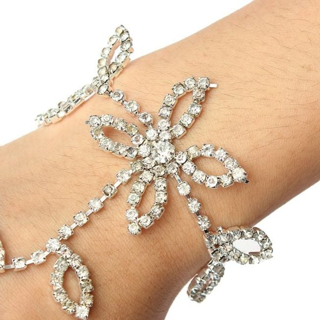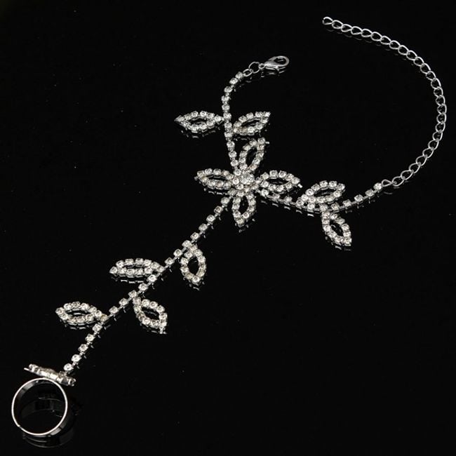 Festlicher Armschmuck mit Steinen, der sich für Bälle oder Partys eignet. Das Armband ist mit Blättern und einer Blume verziert.