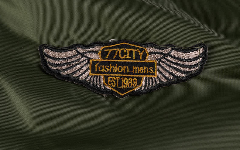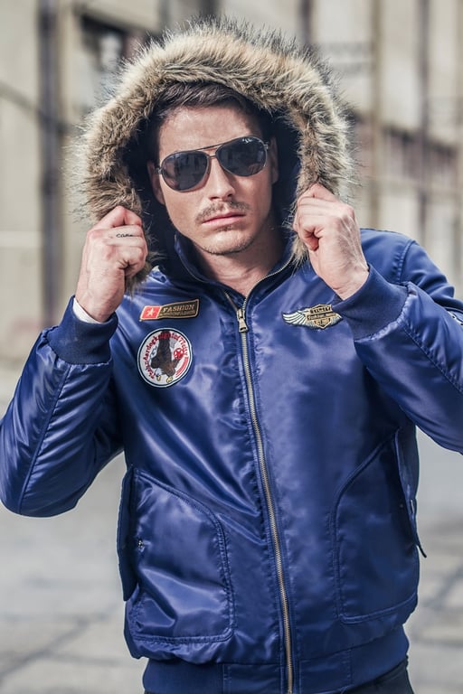 Luxuriöse Herrenjacke mit Aufnähern und klassischem Reißverschluss. Die Jacke hat eine Kapuze, die mit einem angenehmen Fell gefüttert ist.