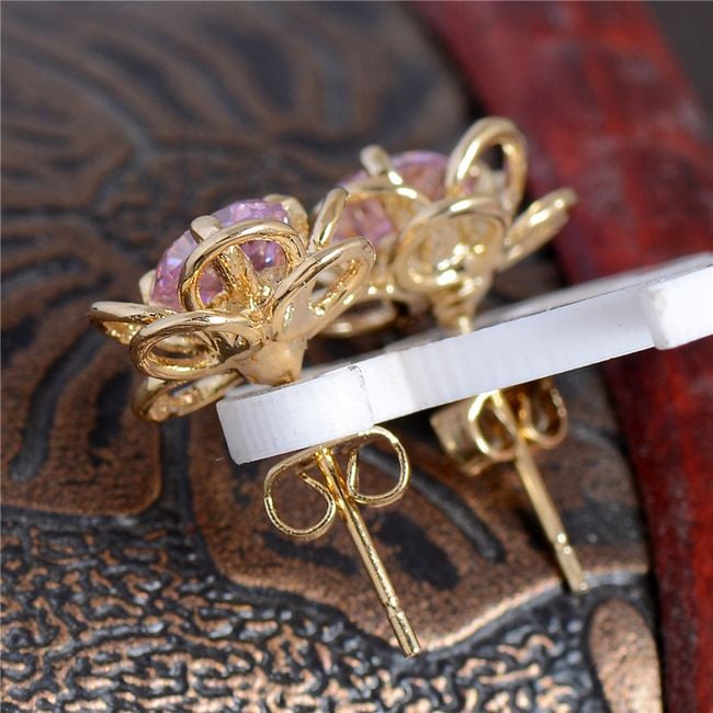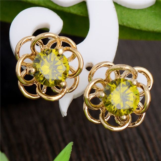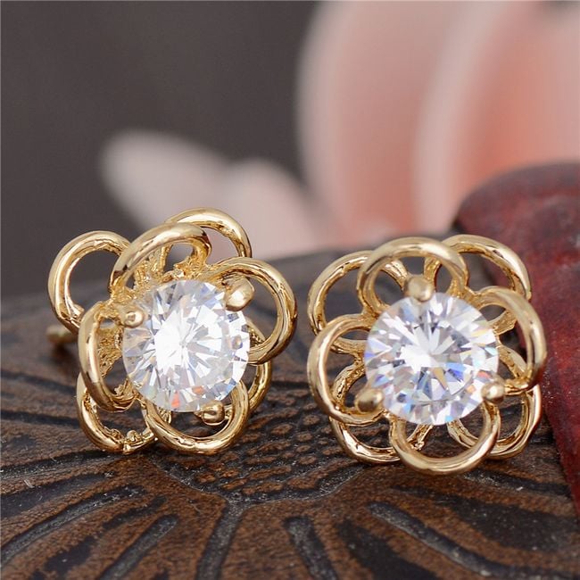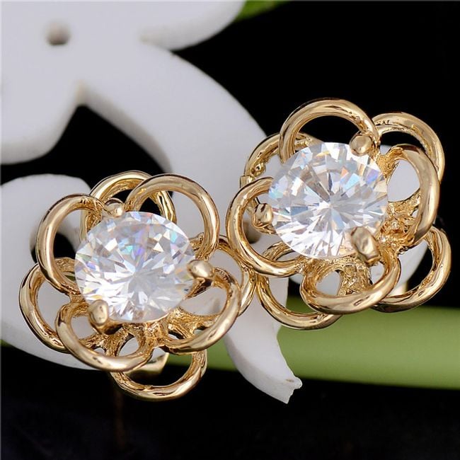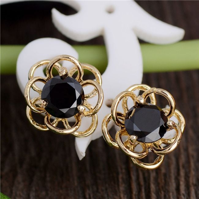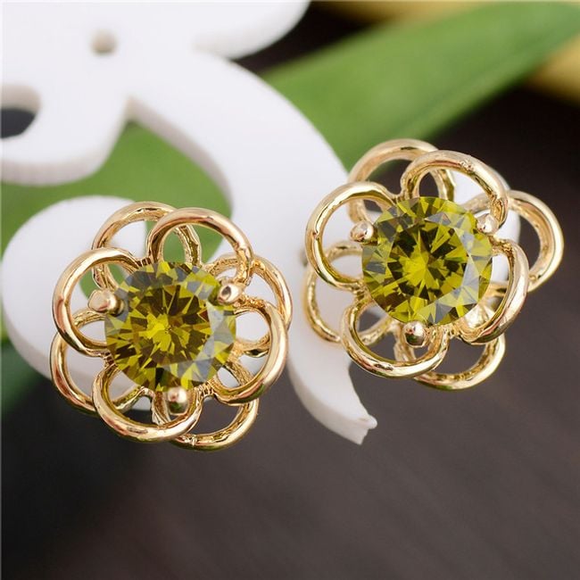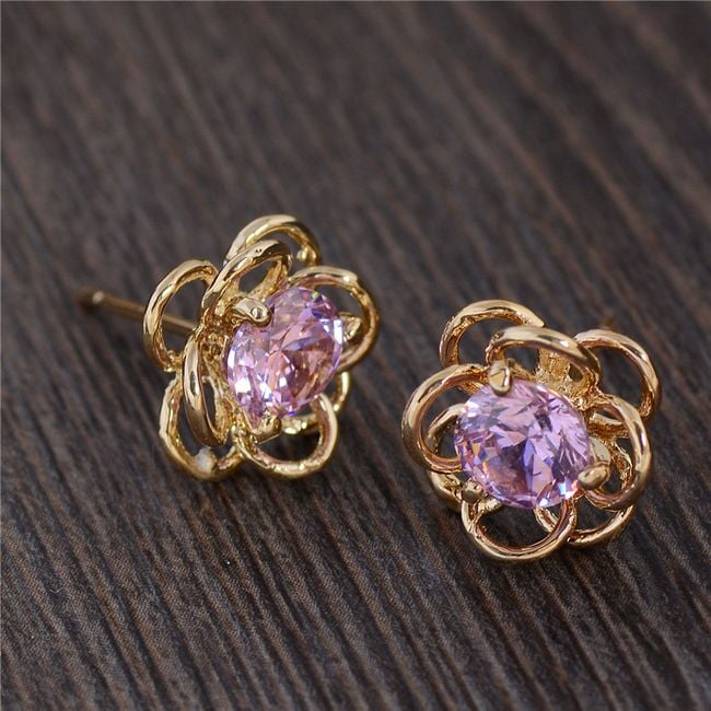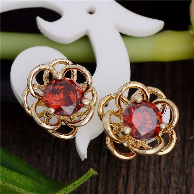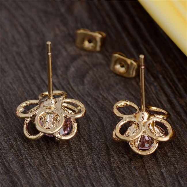 Die Ohrringe haben die Form einer kleinen Blume. Die Mitte ist mit einem bunten Stein verziert. Sie haben die Wahl aus mehreren Farben.