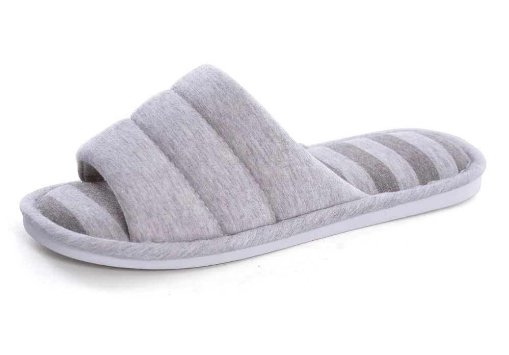 Die Hausschuhe sind gestreift und halten wunderbar warm.