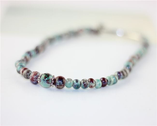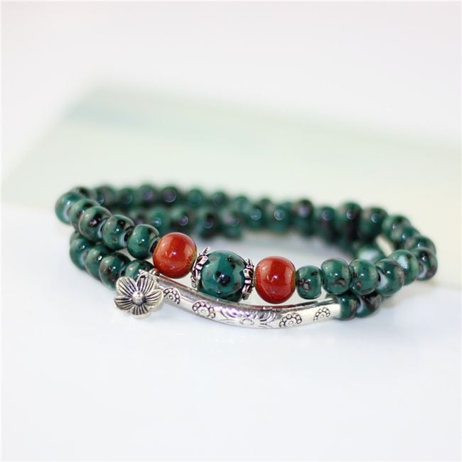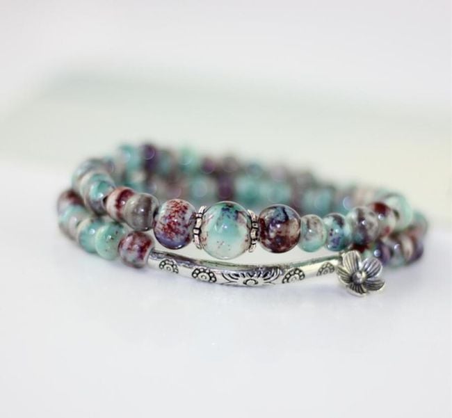 Das mit einer Metallplatte und einer Blume verzierte Perlenarmband ist lang – Sie werden es als doppelt tragen.