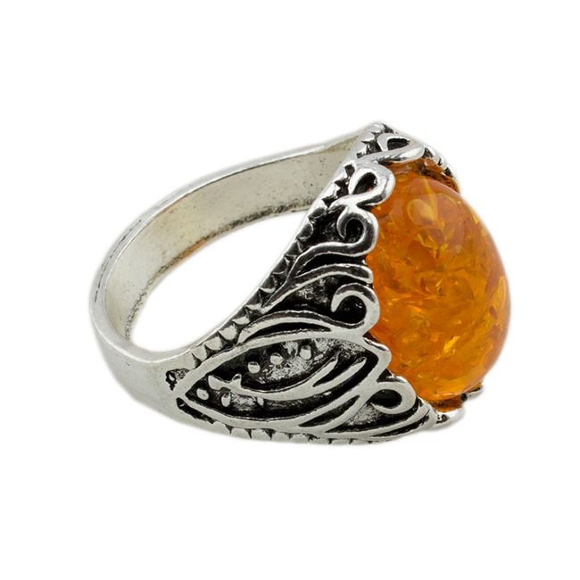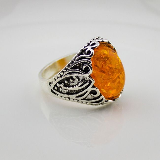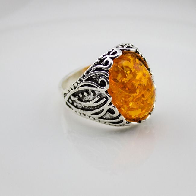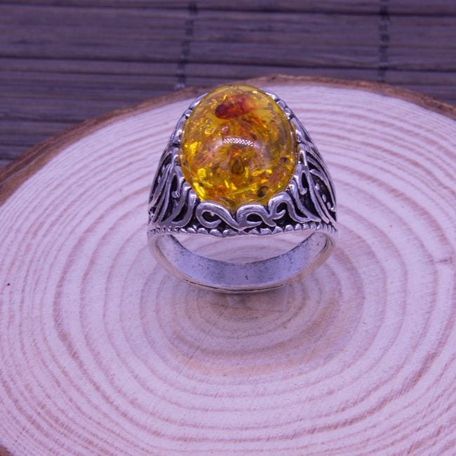 Der Ring mit dem gelben Stein dient als interessantes Accessoire.