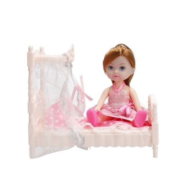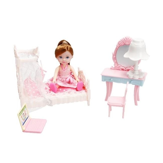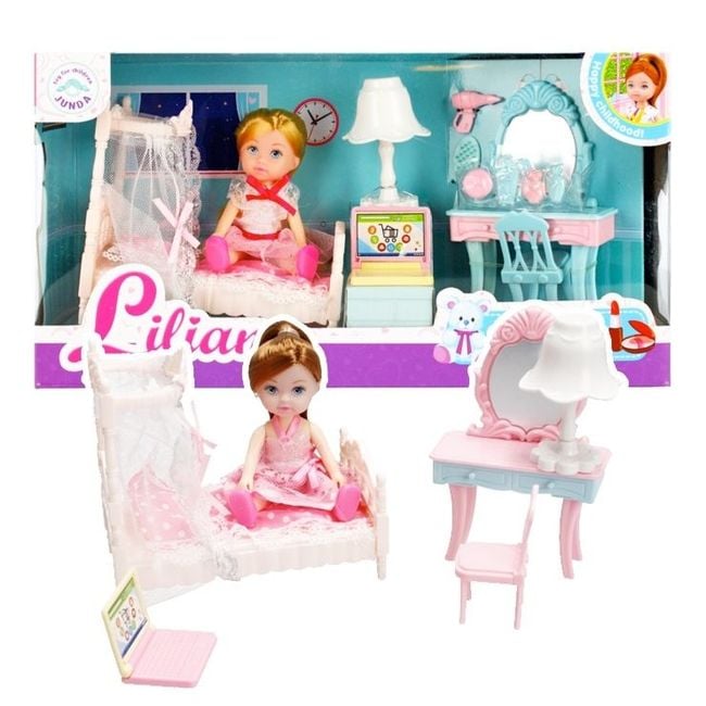 Das Set enthält: eine Puppe, ein Bettchen, einen kleinen Schminktisch, eine Nachttischlampe, ein Notizbuch.
