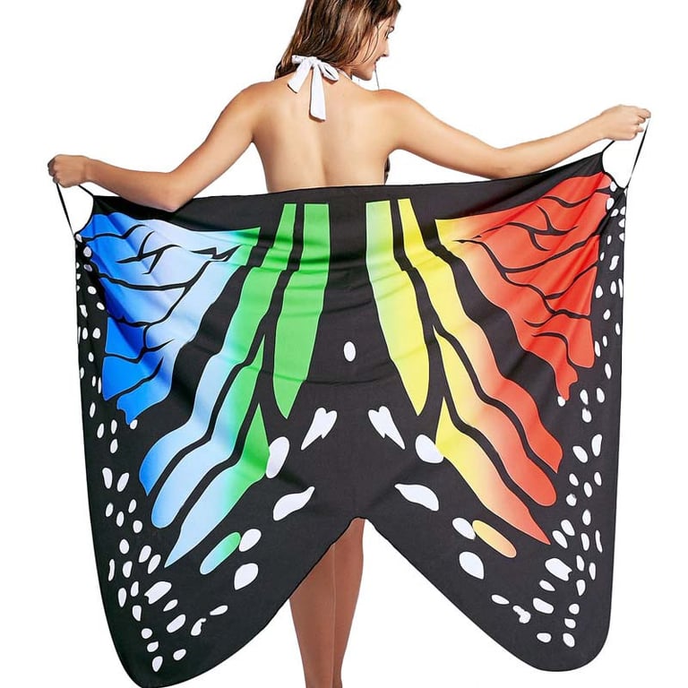 Stylischer farbiger Schal über dem Badeanzug mit Schmetterlingsmotiv, den Sie einfach überwerfen können und bereit sind, überall hinzugehen.