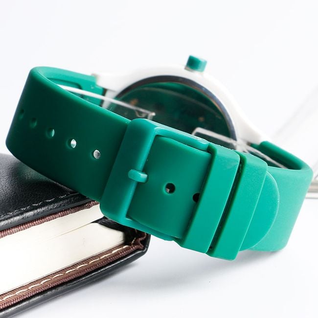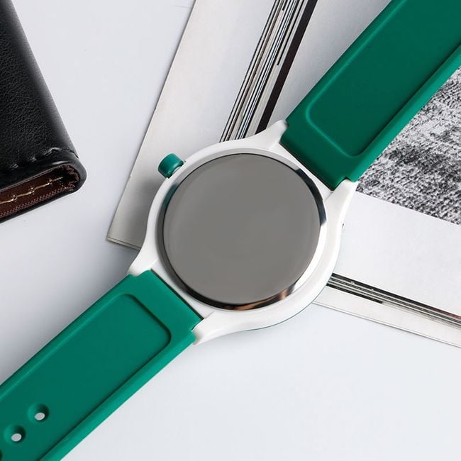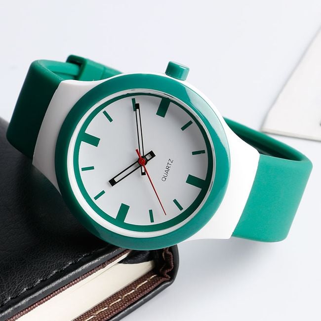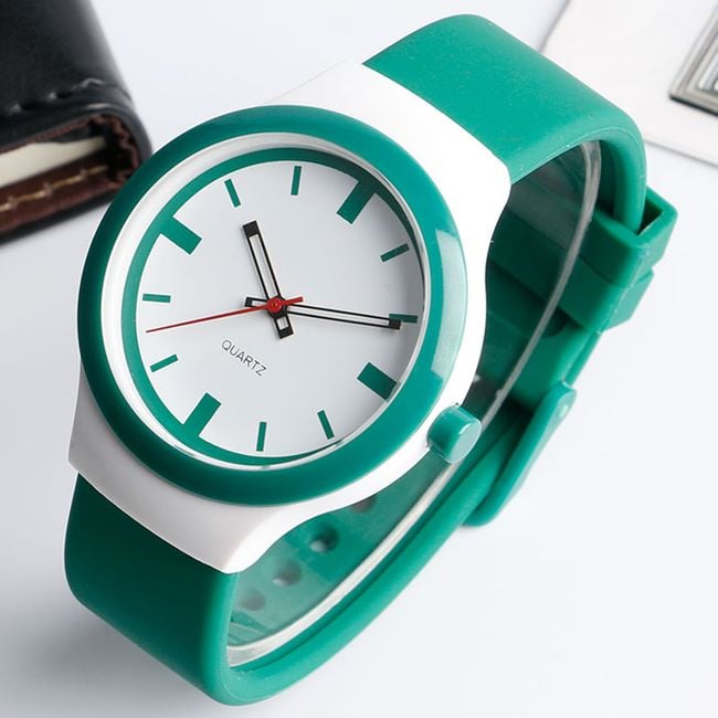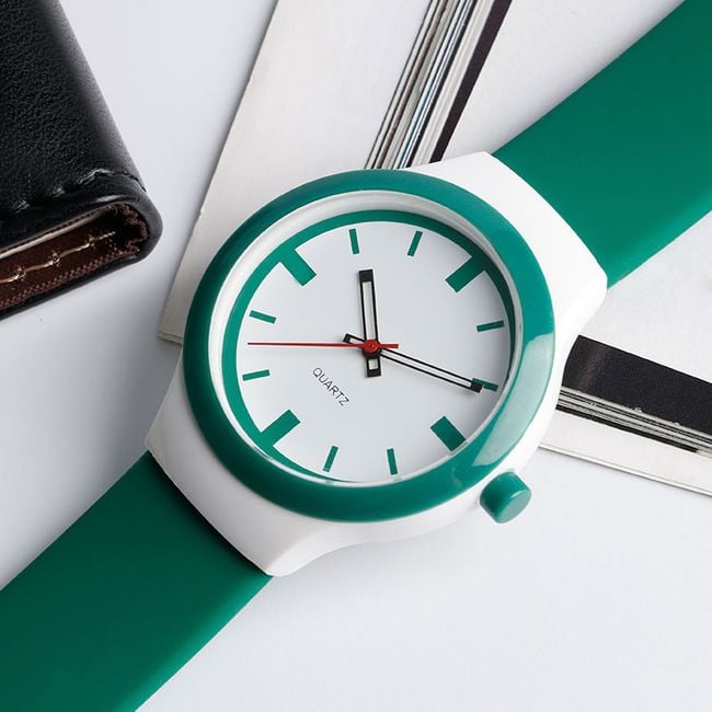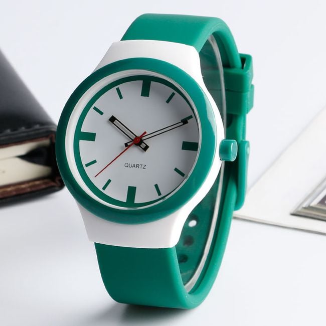 Die mintfarbene Silikon-Uhr wird sowohl am Handgelenk von Damen als auch von Herren auffallen. Das Ziffernblatt ist klassisch mit Zeigern und enthält keine Ziffern.