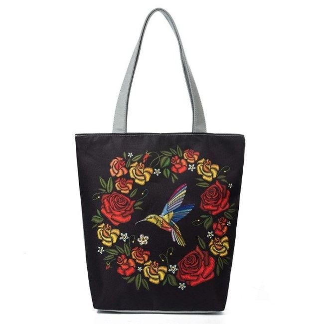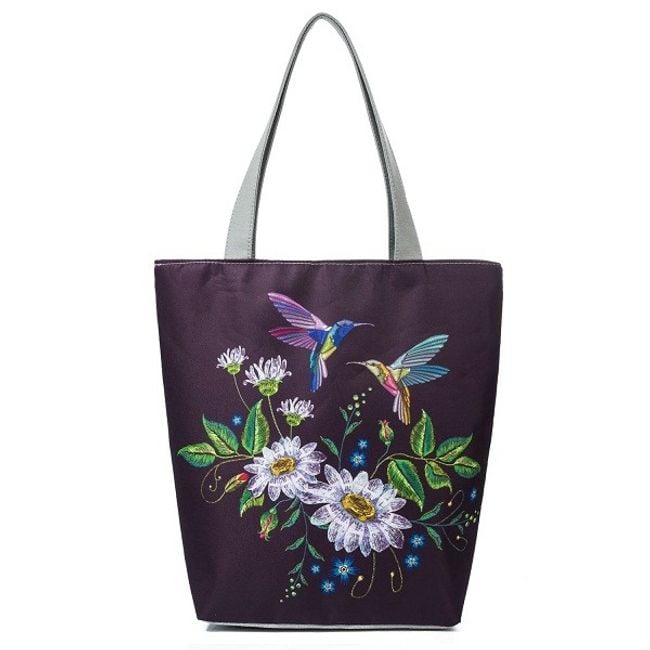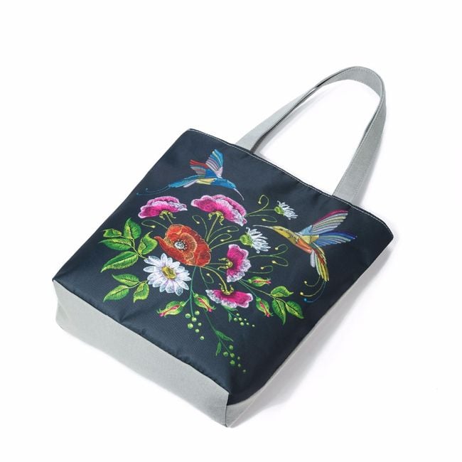 Die Tasche, verziert mit bunten Blumen und Vögeln, verfügt über eine praktische Innentasche mit Reißverschluss, die sich beispielsweise für Schlüssel oder Kleingeld eignet.